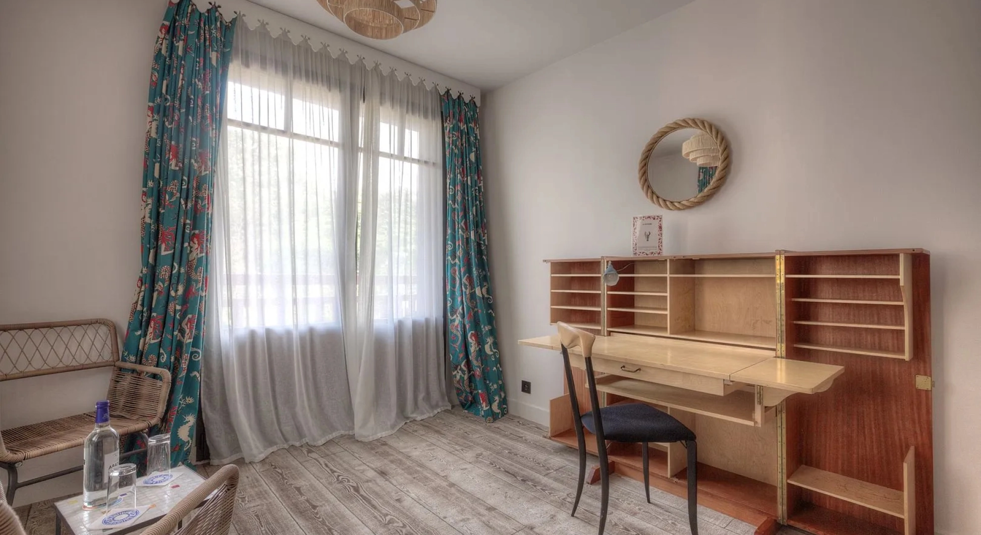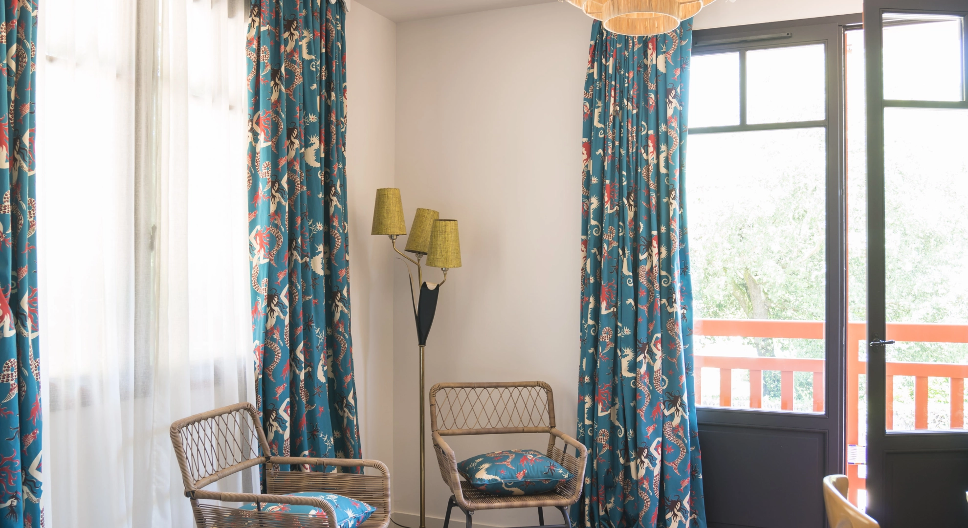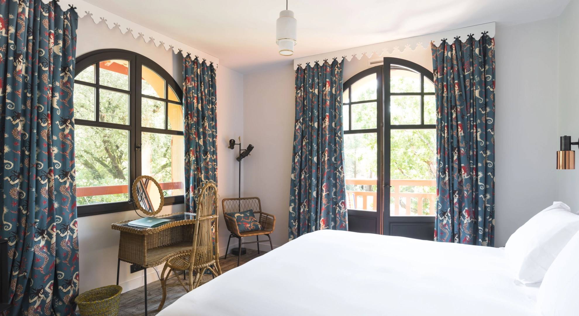 Avec son balcon aménagé, cette chambre mêle douceur et graphisme dans un cadre spacieux.